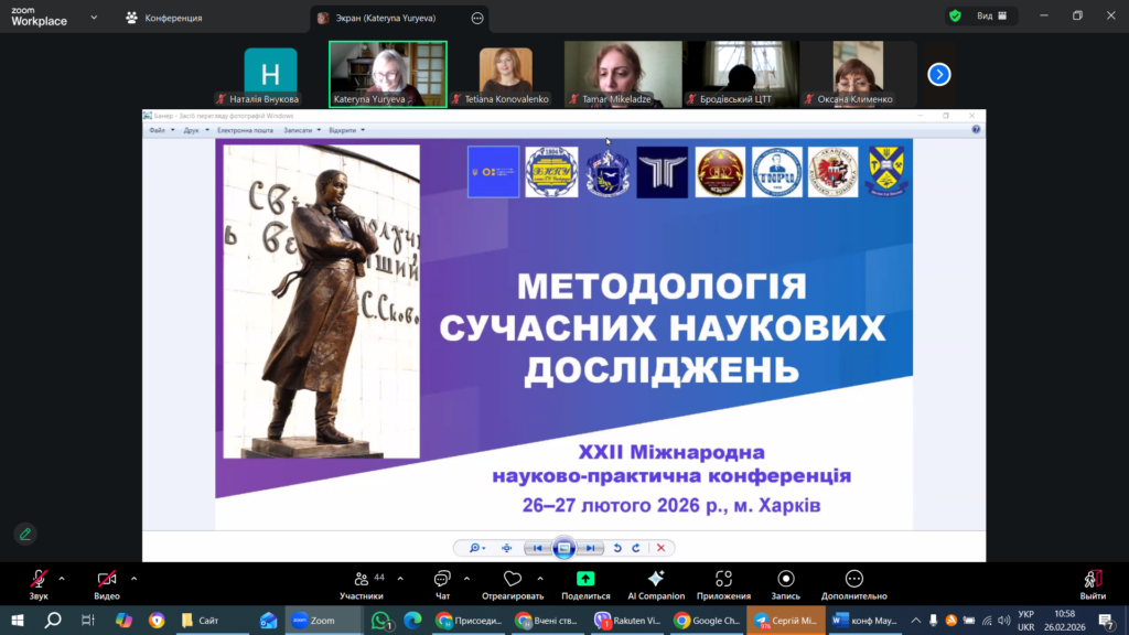 Професор кафедри д.е.н., проф Наталія Внукова 26 лютого 2025 року виступила з доповіддю «Значення наукової діяльності при дистанційній формі вищої освіти рівня магістр» на ХХІІ Міжнародній науково-практичній конференції «МЕТОДОЛОГІЯ СУЧАСНИХ НАУКОВИХ ДОСЛІДЖЕНЬ», організовану Харківським національним педагогічним університетом ім. Г. С. Сковроди., в якій зареєструвались 370 учасників з багатьох країн світу.